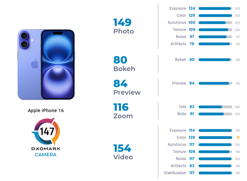 Das neue Flaggschiff von Apple erreichte 147 Punkte und schaffte es damit in die Top 20 der Kamerawertung. Die Experten von DxOMark bemerkten die hohe Helligkeit und den hohen Kontrast der Bilder im HDR-Modus sowie die genaue Übertragung von Hauttönen in Fotos und Videos. Der Autofokus des iPhone 16 wurde als schnell und präzise eingestuft, und die Detailgenauigkeit bei Innenaufnahmen war am besten. Auch die Videoaufnahmen erhielten gute Noten für ihr geringes Rauschen und die effektive Stabilisierung.