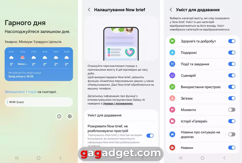 Abgesehen von den neuen KI-Assistenten (siehe unten), sind die wichtigsten Funktionen des Galaxy AI 2025 zwei neue KI-Tools: Now Brief und Now Bar. Bei ersterem handelt es sich um einen Begrüßungsbildschirm, der nach dem Entsperren des Bildschirms eingeblendet wird. Er bietet einige aktuelle Informationen (bei einem neu ausgepackten Smartphone sind dies eine Begrüßung, die Wettervorhersage für den Tag und Kalendereinträge für den heutigen Tag). Der Inhalt dieses Bildschirms kann verwaltet werden (in den Screenshots unten ist die Liste sogar etwas größer als im dritten Bild). Jetzt hat Brief zwei Teile: den Morgenbericht und die Tageszusammenfassung. Am Morgen informiert Sie dieser Bildschirm über Ihren Schlafstatus, das Wetter und den Terminplan. Außerdem werden Vorschläge für Betriebsmodi gemacht, die zu den Szenarien passen, in denen Sie Ihr Smartphone verwenden: Wenn Sie jeden Morgen mit dem Auto zur Arbeit fahren, schaltet es zu einer bestimmten Zeit in den Fahrmodus und startet Ihren bevorzugten Musik-Streaming-Dienst (natürlich nur, wenn Sie ihn im Auto hören).