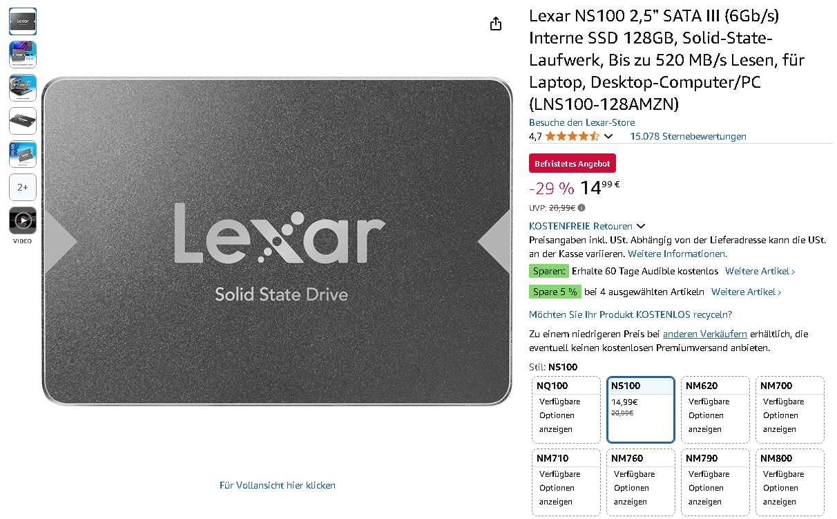 Lexar NS100 SSD 128GB zum Schnäppchenpreis auf Amazon.de