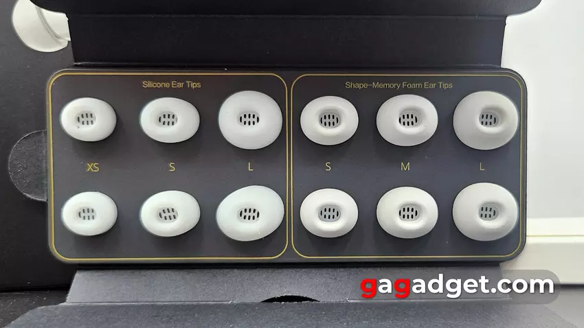 Hier ist die erste Überraschung - das Paket enthält 6 (!) zusätzliche Paare von Ohrpolstern in 3 Größen. Dabei handelt es sich um zwei Sets - eines mit Silikon-Ohrpolstern und das andere mit Schaumstoff-Ohrpolstern, die den sogenannten Memory-Effekt haben, d.h. sie verändern ihre Form leicht und merken sie sich. Das ist ein wichtiger Vorteil, denn Menschen haben unterschiedliche Ohren. Und der feste Sitz (und dazu tragen die Schaumstoff-Ohrpolster bei) sorgt für einen besseren Lärmschutz. Der Rest des Pakets ist Standard - ein USB-C-Kabel (heutzutage hätten sie es vielleicht nicht mehr beigelegt, das Ladegerät ist weg, aber das überrascht heute niemanden mehr) und zwei Broschüren - eine Garantiekarte und ein Benutzerhandbuch.