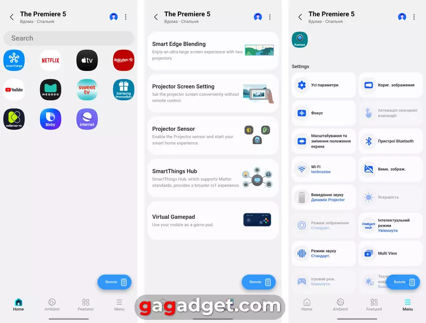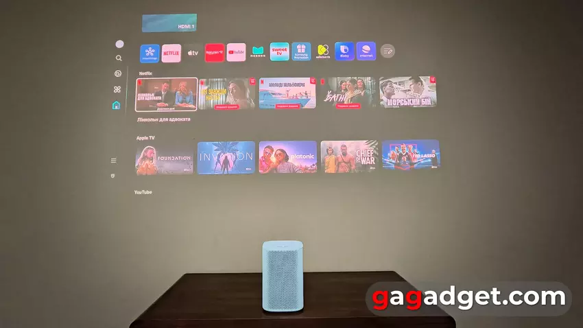 Dementsprechend können Sie mit dem Premiere 5 Filme auf einer 100-Zoll-Leinwand auch ohne künstliche Dimmung ansehen (solange kein direktes Sonnenlicht im Raum ist), obwohl das Ergebnis natürlich am Abend oder bei geschlossenen Nachtvorhängen viel interessanter ist. Und trotz des Helligkeitsverlustes gegenüber "Kino"-Projektoren (auch bei der Bildauflösung - FullHD vs. 4K) ist der Premiere 5 immer noch ein leistungsstarker Smart-Projektor mit allen Vorteilen von Tizen - er ist in das SmartThings Smart Home System integriert, arbeitet nativ mit OTT-Diensten (und benötigt keine Quellen, um Filme und TV-Sendungen zu sehen), hat einen eingebauten funktionalen Browser, mit dem man Videos auf Websites ansehen kann, und kann Bilder von Samsung-Tablets und -Smartphones drahtlos wiedergeben. Wie immer in solchen Fällen erhalten Besitzer anderer Samsung-Geräte also ihre eigenen zusätzlichen Vorteile bei der Nutzung.