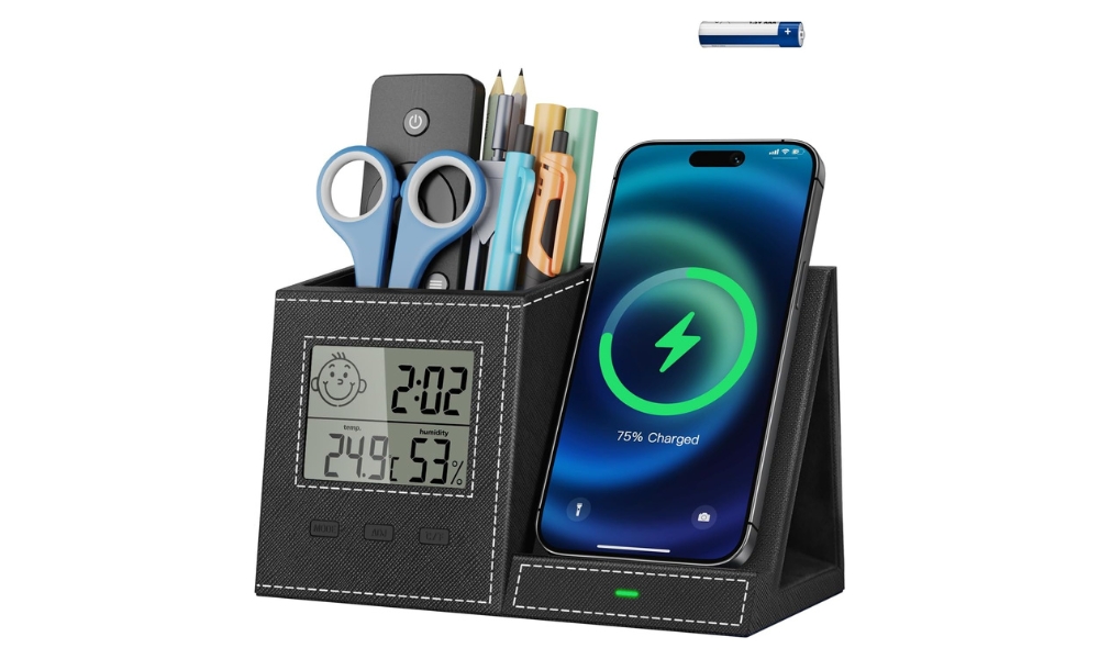 Der TopMade Organizer kombiniert kabelloses Aufladen des Telefons mit Stifthalter, Uhr, Thermometer und Luftfeuchtigkeitsmesser in einem einzigen Tischgerät. Funktioniert mit iPhone 16/15/14/13 und Samsung Galaxy S25/24/23 Modellen. Lädt durch Hüllen unter 5 mm Dicke auf. PU-Leder außen mit Samtfutter verhindert Kratzer. Zwei Fächer zur Aufbewahrung von Stiften und kleinen Gegenständen. Kompakte Abmessungen von 4,13 x 6,77 x 4,37 Zoll, passend für Standard-Schreibtische.