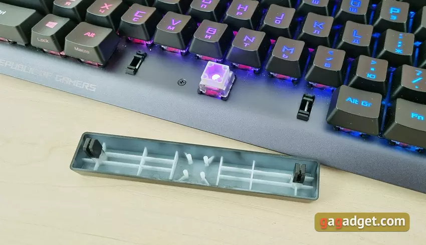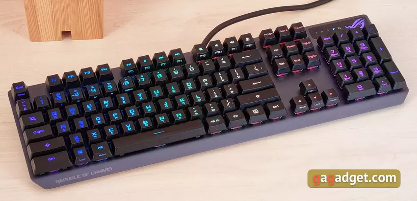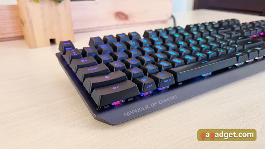 Bei der Montage gibt es keine Beanstandungen: Das ASUS ROG Strix Scope RX ist wunderschön verarbeitet. Alles passt perfekt, die Konstruktion ist sehr steif, verbiegt nicht und "knirscht" nicht. Dazu kommt der Staub- und Wasserschutz nach dem IP56-Standard. Die Spezifikation besagt, dass eine gewisse Menge an Staub in die Struktur eindringen kann, aber den Betrieb des Geräts nicht beeinträchtigen wird. Und auch die Tastatur hat keine Angst vor direkten starken Wasserspritzern. Die ASUS ROG Strix Scope RX geht also nicht kaputt, wenn Sie versehentlich Tee darauf schütten.