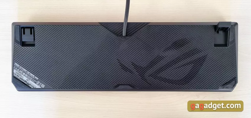 Die Unterseite der Tastatur ist aus mattem Kunststoff gefertigt, mit dem ROG-Logo und dekorativen Diagonalstreifen über die gesamte Fläche. Für die Stabilität sorgen vier bekannte gummierte Füße in den Ecken sowie eine zusätzliche Plattform in der Mitte der Vorderkante der Tastatur: