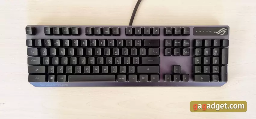 Es handelt sich um lineare Schalter ohne Touch-Reaktion (es gibt auch Touch-Schalter der ROG RX Blue). Der volle Hub beträgt 4 mm und der Betätigungspunkt ist 1,5 mm entfernt. Die Druckkraft beträgt 40 Gramm, vor der Betätigung 45 Gramm und die Gesamtkraft beträgt 55 Gramm. Um von der Theorie zur Praxis zu kommen: Die Schalter sind wirklich blitzschnell und sehr leicht zu betätigen. Und das hat sowohl Vor- als auch Nachteile. In Spielen macht die Tastatur eine gute Figur, vor allem bei schnellen Ego-Shootern und Actionspielen. Die ASUS ROG Strix Scope RX ist sehr reaktionsschnell und reagiert sofort auf alle Ihre Aktionen.