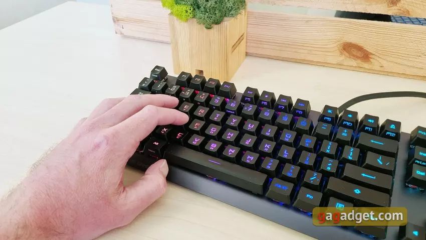 Wichtig! - es ist nach dem IP56-Standard vor Staub und Wasser geschützt. Er verfügt über eine vollständig anpassbare RGB-Beleuchtung, Profilunterstützung, einen On-Board-Speicher, eine benutzerfreundliche App und die Möglichkeit zur schnellen Einrichtung mit Tastaturkürzeln. Und als nützlicher Bonus gibt es einen Pass-Through-USB-Anschluss, um Zubehör anzuschließen. Wenn wir ASUS ROG Strix Scope RX als universelle Option für Spiele und Arbeit betrachten, ist die Option eher umstritten. Aufgrund der sehr schnellen Reaktion, des geringen Aufwands und des Hubs, der zum Aktivieren der ROG RX Red erforderlich ist, kann es zu regelmäßigen Fehltasten beim schnellen Tippen kommen.