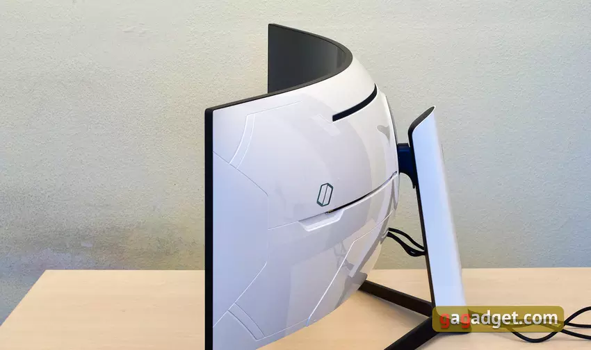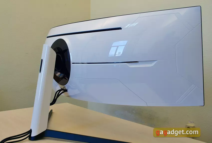 Die Rückseite des Samsung Odyssey G9 besteht fast vollständig aus glänzendem weißen Kunststoff. In der Mitte befindet sich ein dekorativer silberner Streifen und auf der linken Seite das Logo der Samsung Odyssey Gaming-Serie. Um die Stelle, an der der Standfuß am Monitor befestigt ist, befindet sich eine kreisförmige RGB-Infinity-Core-Beleuchtung. Der Standfuß selbst ist abnehmbar, an seiner Stelle kann eine VESA-Wandhalterung angebracht werden. Der untere Teil des Gehäuses mit allen Anschlüssen wird durch den abnehmbaren Deckel abgedeckt.