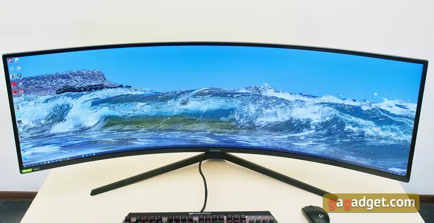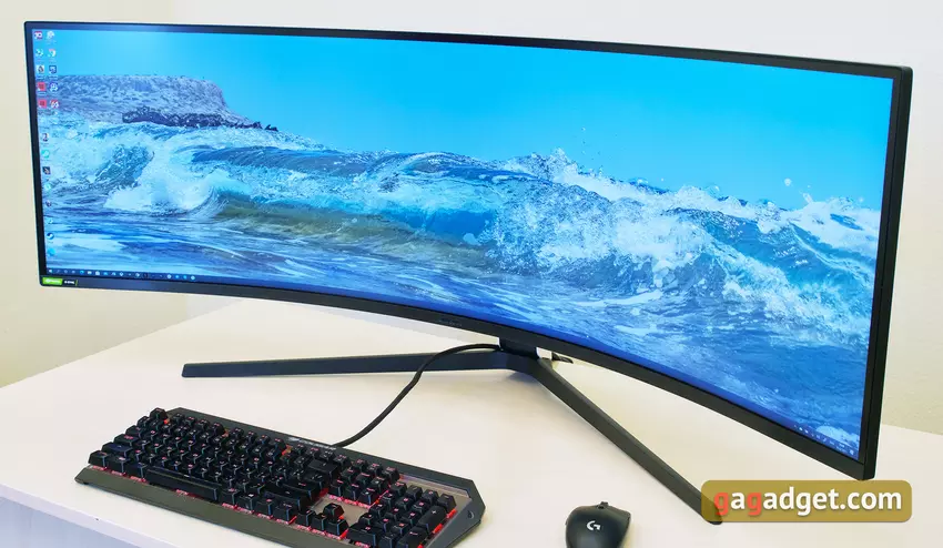 Der Monitor verfügt über ein 49 Zoll (48,8) großes, gebogenes 10-Bit-VA-Panel mit QLED-Technologie (Quantum Dot Light Emitting Diode), einfach gesagt - Quantenpunkte. Es ist erwähnenswert, dass es sich um einen "ehrlichen" 10-Bit-Bildschirm handelt und nicht um 8+2 FRS, der einen Farbumfang von 88 % NTSC 1976, 125 % sRGB und 92 % Adobe RGB liefert. Der Krümmungsradius beträgt 1000R, die Auflösung 5120x1440 (Pixelabstand - 0,233 mm, Pixeldichte - 109 PPI), es wird eine W-LED Hintergrundbeleuchtung verwendet.