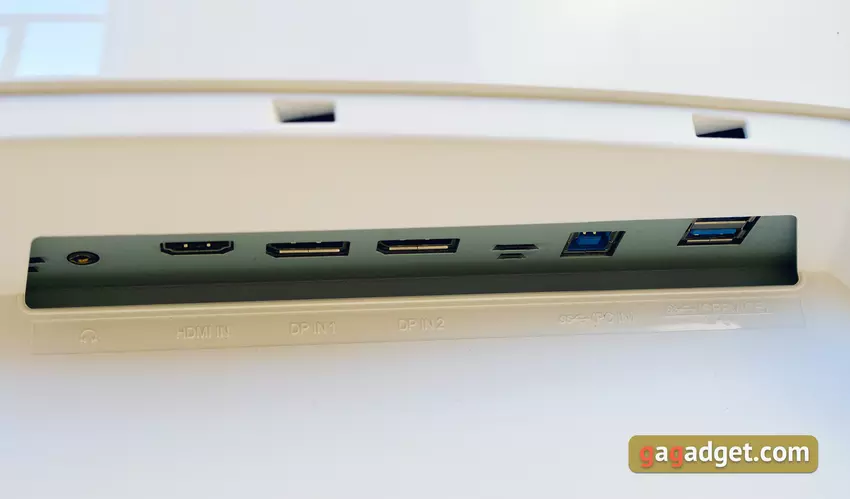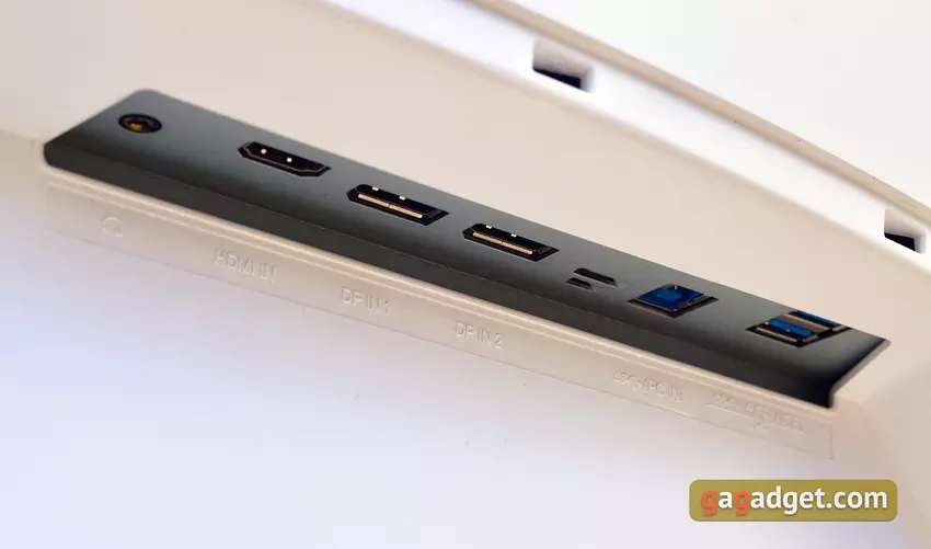 Die Anschlussausstattung kann man nicht als super reichhaltig bezeichnen, aber das Nötigste ist vorhanden. Zwei DisplayPort-Eingänge der Version 1.4 und ein HDMI-Eingang der Version 2.0. Warum es im aktuellen Flaggschiff-Modell kein 2.1 gibt, ist ein Rätsel. Dann gibt es noch eine 3,5-mm-Kopfhörerbuchse und zwei USB-3.0-Anschlüsse. Aus irgendeinem Grund hat sich Samsung auch entschieden, Type-C und Thunderbolt zu ignorieren.