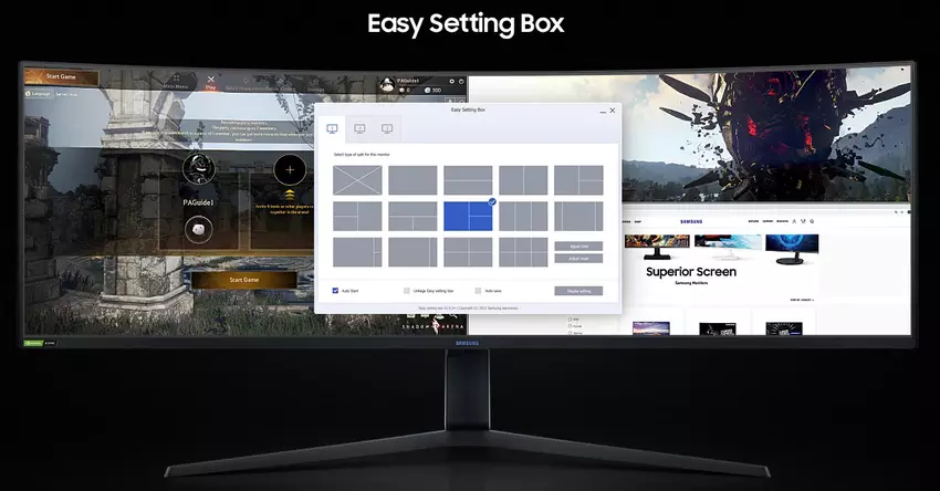 Im Übrigen gibt es keine weiteren Schwierigkeiten bei der Nutzung des Monitors. Wenn wir über das Arbeiten am Samsung Odyssey G9 und generell über die Vorteile dieses Formats sprechen, sollten wir berücksichtigen, dass wir tatsächlich ein Äquivalent von zwei 27-Zoll-Monitoren mit einem 16:9-Verhältnis und einer Auflösung von 2560x1440 haben, die zusammengeklebt sind. Wenn Sie also an zwei Monitore gewöhnt sind, wird es keine Fragen geben: Tabellenkalkulationen auf der einen und ein Browser auf der anderen Seite, eine gestreckte Zeitleiste in Video-/Audio-Editoren, zwei Signalquellen gleichzeitig - das ist alles sehr komfortabel. Aber es ist ein wenig gewöhnungsbedürftig. Für die schnelle und bequeme Raumaufteilung gibt es das eingebaute Dienstprogramm Easy Setting Box.