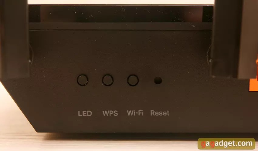 Aus meiner Sicht ist es nicht notwendig, so ähnliche Buttons mit so unterschiedlichen Zwecken zu erstellen. Aber der Techno-Designer-Perfektionist entschied, dass es schöner wäre, und fügte sogar eine weitere Taste in diese Reihe ein - zum Zurücksetzen des Gerätes. Danke, dass es wenigstens so gemacht wurde, wie es sein sollte, vertieft. Technisch gesehen sind Kommentare über die Benutzerfreundlichkeit des Routers bedeutungslos ohne Informationen darüber, wo er installiert ist. Wenn die Tasten gut sichtbar sind, dann ist das keine Frage. Oder man benutzt sie vielleicht gar nicht.