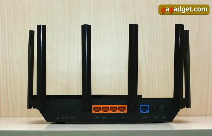 Das AX5400 bedeutet, dass unser Gerät Wi-Fi 6 (also den Standard IEEE 802.11ax) unterstützt und mit Geschwindigkeiten von bis zu 5400 Mbit/s arbeitet. Wir sprechen hier von der Summe der Geschwindigkeiten in allen Bereichen: bis zu 4804 Mbit / s bei 5 GHz und bis zu 574 Mbit / s bei 2,4 GHz.