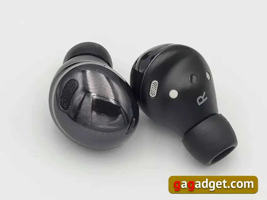 Die Kopfhörer von Samsung sind kleiner, haben aber zwei Ladekontakte (die Metallkreise auf der rechten Seite des Kopfhörers im Bild), dazwischen einen Näherungssensor (damit kann man feststellen, dass der Kopfhörer vom Ohr entfernt ist, und die Musik pausieren). Außerdem gibt es drei Mikrofone, einen Knochenleitfähigkeitssensor, zwei Lautsprecher (einen 11-mm-Tieftöner und einen 6,5-mm-Hochtöner) und drei Luftungslöcher. Zwei davon haben Mikrofonen und eine (an der Innenseite der Hörmuschel) ist für Reduzierung der Okklusion, d. h. der Verzerrung der eigenen Stimme durch den eng überlappenden Gehörgang. Außerdem befinden sich ein Prozessor und eine Batterie inerhalb der Hörmuschel, ohne dass andere zugehörige Elektronik mitgerechnet werden.