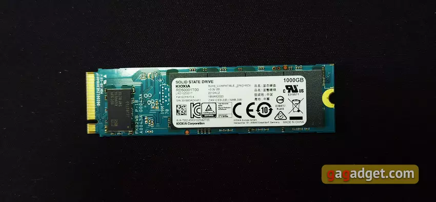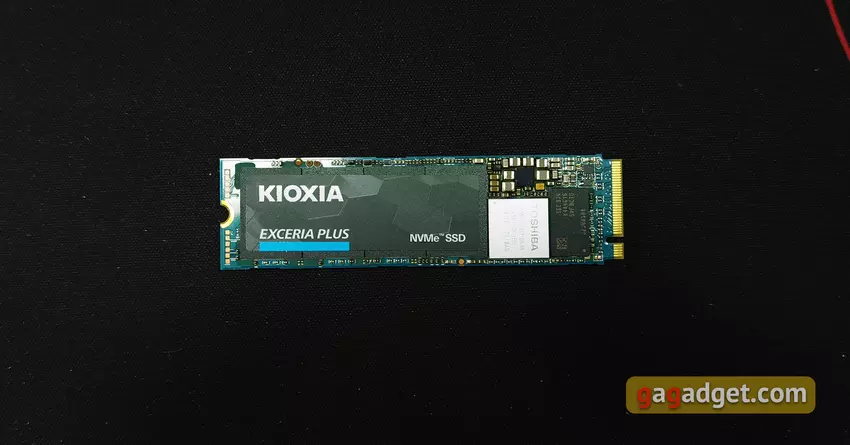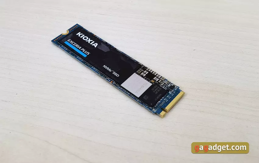 Die Kioxia Exceria Plus ist eine typische M.2-SSD im 2280er-Formfaktor mit PCI Express 3.0 x4-Schnittstelle. Im Gegensatz zu einigen Top-Gaming-Modellen ist kein zusätzlicher Kühlkörper vorhanden. Auf der Vorderseite befindet sich ein Aufkleber mit dem Namen des Modells, darunter befinden sich vier Toshiba-Flash-Chips. Daneben befindet sich ein Controller, ebenfalls von Toshiba. Und etwas rechts daneben - ein DRAM-Cache-Chip. Laut Google - hergestellt von Samsung.