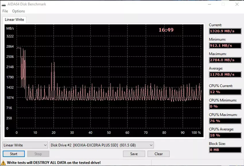 Der lineare Schreibtest in AIDA64 zeigt, dass das Volumen des SLC-Caches bei etwa 30-40 GB liegt, danach gibt es einen Einbruch. Die Schreibgeschwindigkeit sinkt aber erst unter 900+MB/s, wenn das Laufwerk voll ist und bleibt im Durchschnitt bei 1200MB/s. Dies ist ein guter Wert, denn bei günstigeren Modellen kann die Geschwindigkeit unter 200 MB/s fallen.