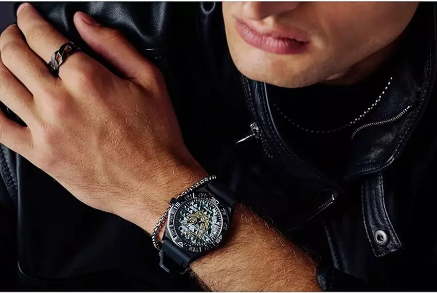 Das Modell ist in den Farben Schwarz und Grün gehalten, inspiriert vom Black Panther Bild. Das Zifferblatt ist in einem dreieckigen Muster in grünen, schwarzen und weißen Farbtönen gestaltet, mit einem goldenen Logo in Form der Heldenmaske im Zentrum. Zusätzliche violette Akzente sind auf der Minutenskalierung angebracht, mit einer schwarzen ionenbeschichteten Lünette drumherum.