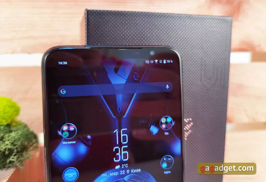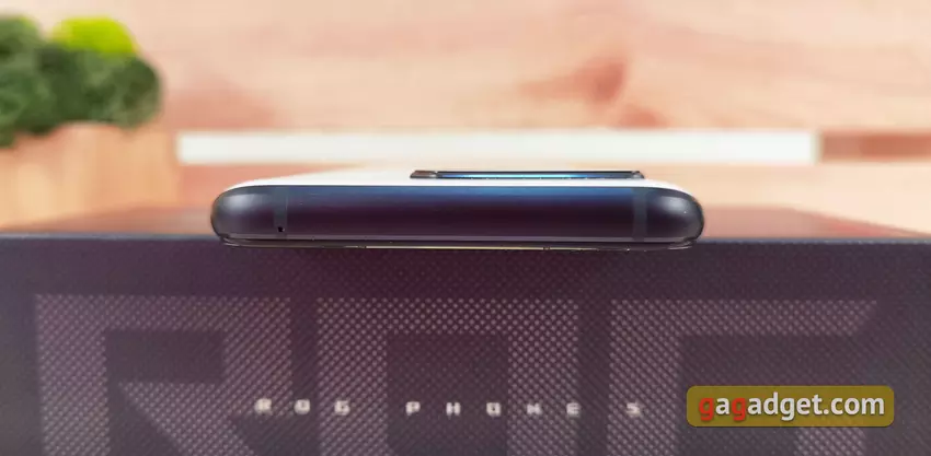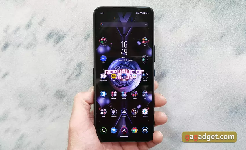 Das ASUS ROG Phone 5 sieht ziemlich einzigartig aus. Naja, so sehr wie es in der heutigen Realität sein kann. Es ist groß und sehr schwer: 8,4 oz (238 Gramm) sind kein Witz. Das Gehäuse ist aus Glas und Metall gefertigt. An der Vorderseite befindet sich ein großer Bildschirm mit abgerundeten Ecken und ohne Ausschnitte. ASUS hat sich entschieden, mobilen Gamern keinen nützlichen Platz wegzunehmen. Gleichzeitig sind die Aussparungen unterhalb und oberhalb des Bildschirms absolut symmetrisch, so dass es sehr ästhetisch aussieht.