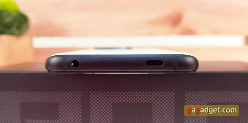 Oberhalb des Bildschirms: ein breiter Schlitz für den Lautsprecher, die Frontkamera und (!) eine LED-Anzeige, die wir schon lange nicht mehr in Smartphones gesehen haben. Unter dem Bildschirm befindet sich ein ähnlicher Schlitz für den zweiten Lautsprecher. Die Einfassung ist an den Seiten sehr dünn. Die gesamte Frontplatte ist mit Glas bedeckt, die Kanten sind leicht abgerundet. Der Hersteller nennt dies 2.5D.
