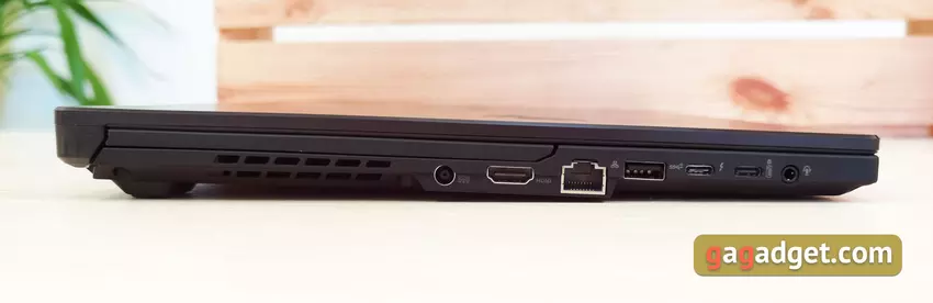 Trotz der sehr beeindruckenden Hardware im Inneren und der 17,3-Zoll-Diagonale ist das Notebook recht dünn: knapp 2 cm. Das Notebook verfügt über eine ordentliche Anzahl von Anschlüssen. Auf der linken Seite () befinden sich eine Buchse für das Netzteil, HDMI 2.0b, RJ-45 für das Netzwerk, USB-A 3.2 Gen 2 in voller Größe, Thunderbolt 4, USB-C 3.2 Gen 2 (mit DisplayPort- und Power-Delivery-Unterstützung) und eine 3,5-mm-Kombo-Audiobuchse.