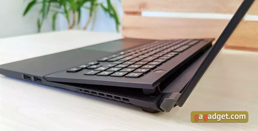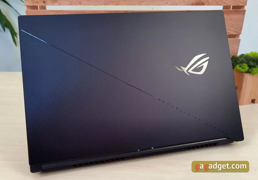 Das ASUS ROG Zephyrus S17 GX703 verwendet seit langem ein ungewöhnliches Design bei Laptops mit einer erhöhten Arbeitsfläche. Es gibt Varianten mit einem zusätzlichen erhöhten Bildschirm. Das ASUS ROG Zephyrus S17 hingegen hebt die Tastatur an, wenn das Notebook geöffnet wird. Dies geschieht, um die Kühlung der leistungsstarken Innereien des Notebooks zu verbessern. Außerdem kann die Tastatur in dieser Position bequemer angewinkelt werden. Das Notebook selbst besteht aus einer Magnesium- und Aluminiumlegierung und ist ganz in Schwarz gehalten. Und insgesamt sieht der Laptop im Gegensatz zu den meisten Gaming-Modellen nicht zu auffällig aus. Die Oberfläche hat eine Soft-Touch-Beschichtung. Es fühlt sich sehr angenehm an, sammelt aber aktiv Gebrauchsspuren. Die obere Abdeckung ist, wie bei den meisten Zephyrus-Modellen, diagonal in zwei Teile geteilt. Die Oberseite ist mit dem ROG-Logo versehen, die Unterseite mit dekorativen Perforationen.