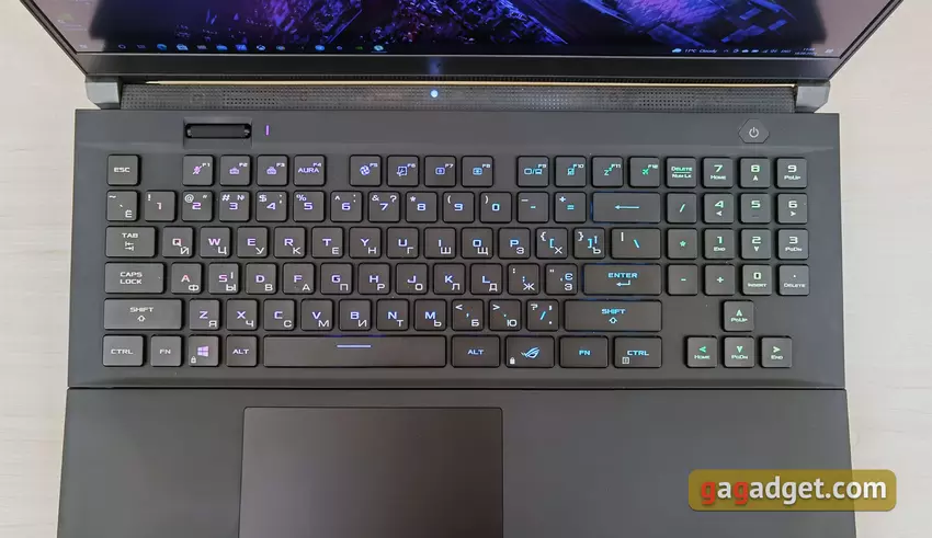 Das Layout des ASUS ROG Zephyrus S17 GX703 ist vollwertig, wenn auch nicht ganz Standard. Im Allgemeinen ist der Hauptblock vertraut: langer Shift, einstöckiger Enter. Es gibt jedoch einen zusätzlichen Nummernblock, und zwischen diesem und dem Hauptblock befinden sich die Tasten Num Lock/Delete, /, * und -. Darunter befindet sich ein separater Block von Pfeilen, der mit Home, End, PgUp, PgDown kombiniert ist. Die Funktionen sind nicht kritisch, aber es wird einige Zeit dauern, sich an sie zu gewöhnen. Ein weiteres Merkmal ist das multifunktionale Scrollrad oberhalb der Tastatur, das für verschiedene Aktionen in einer eigenen Anwendung eingerichtet werden kann. Die Standardeinstellung ist Lautstärkeregelung und Stummschaltung beim Drücken. Die Einschalttaste befindet sich rechts oberhalb der Tastatur und ist mit einem Fingerabdruckscanner kombiniert.