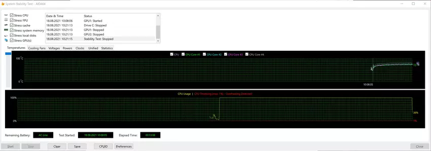 Das Notebook wird durch ein Active Aerodynamic System (AAS) Plus-Lufteinlasssystem (einschließlich einer aufklappbaren Tastatur), sechs Heatpipes, zwei Arc Flow-Lüfter mit je 84 Blättern und vier Radiatoren gekühlt. Und Thermal Grizzly's Liquid Metal wird als thermische Schnittstelle verwendet. Eine beeindruckende Einrichtung, aber die Hardware im Laptop ist auch ziemlich heiß. Wie der AIDA64-Stresstest zeigt, steigt die Temperatur im Inneren auch bei dauerhafter Höchstbelastung nicht über 80°. Dementsprechend wird kein Traben beobachtet. Aber das Gehäuse selbst wird warm, und der CO macht merkliche Geräusche. Allerdings kann man nicht sagen, dass das Notebook lauter ist als andere Gaming-Modelle.