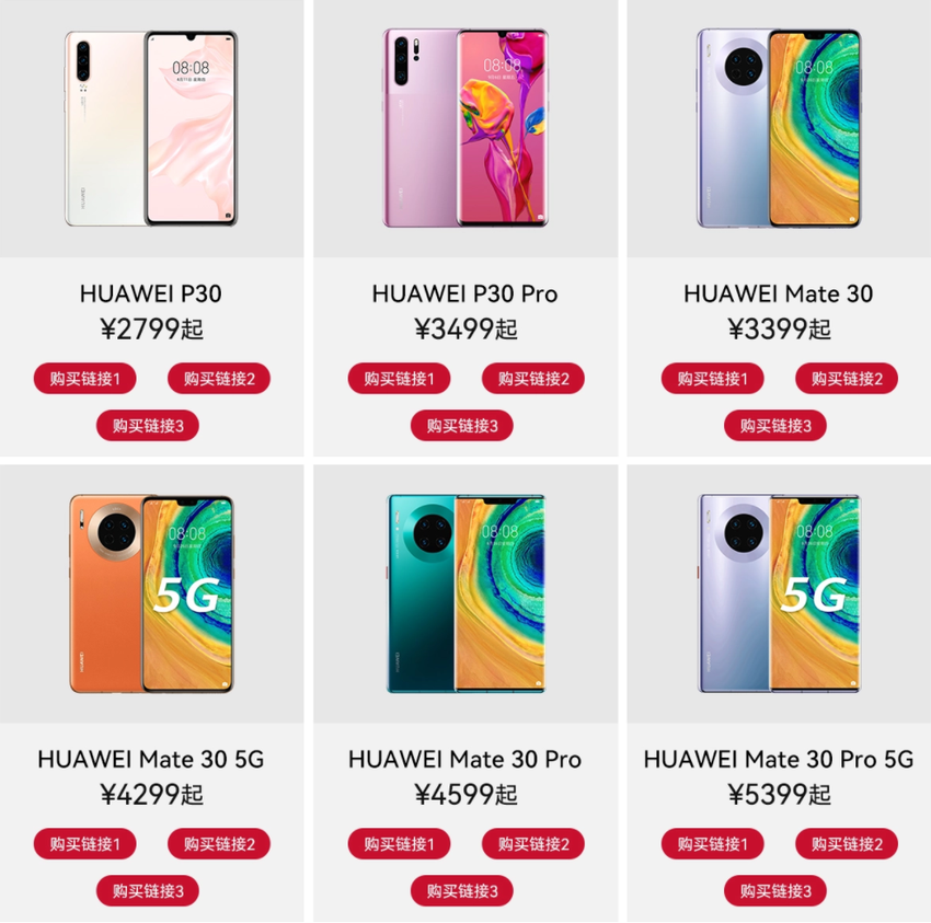 Das Sortiment umfasst nun die Smartphones der Huawei P30- und Mate 30-Serie, und Preise reichen von 2000 bis 6000 Yuan (300-900 Dollar). Zum Beispiel, die Huawei P30 ist für 2.799 Yuan gefragt, und das ist etwa $430 .
