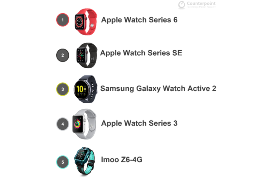Die fünf beliebtesten Smartwatches im zweiten Quartal 2021 waren gleich drei Apple-Modelle. Die Apple Watch Series 6 und Series SE belegten die Plätze 1 und 2, während die Apple Watch Series 3 auf Platz 4 landete. Die Samsung Galaxy Watch Active 2 rundet die Top drei ab, während die Top fünf das Imoo Z6-4G ist.