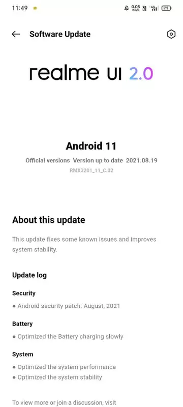 Das System wurde mit der Build-Nummer RMX3201_11_C.02 veröffentlicht und wiegt etwa 500MB. Die Besitzer der Geräte in Indien haben bereits damit begonnen, das Update zu erhalten. In anderen Regionen sollte die Firmware in den nächsten Tagen verfügbar sein.