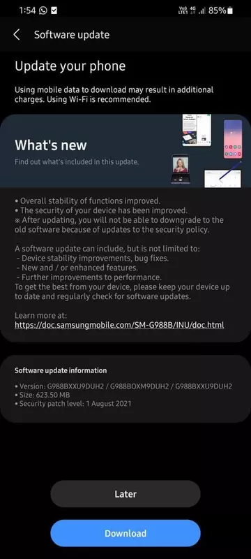 Das System wurde für die Galaxy S10-, Galaxy S20-, Galaxy Note 10- und Galaxy Note 20-Reihe mit den Build-Nummern G97xFXXUCFUH3, G98xBXXU9DUH2, N97xFXXU7FUH3 bzw. N98xBXXU3DUH2 veröffentlicht. Je nach Modell wiegt die Firmware zwischen 623 MB und 927 MB. Die Software enthält den Google-Sicherheitspatch vom August, mit dem einige Systemschwachstellen geschlossen werden, sowie mehrere neue Funktionen. Zum Beispiel haben die Entwickler die Möglichkeit hinzugefügt, den Schlafenszeitmodus schnell zu aktivieren. Darüber hinaus hat die Firmware die Kamera, flüssige Animationen, die Geschwindigkeit des Fingerabdruckscanners und das Wärmemanagement verbessert.