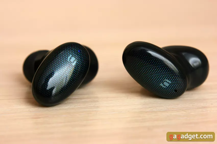 Die Kopfhörer selbst sind dunkelblau. Sie haben eine ungewöhnliche Form: eine Mischung aus langen Modellen mit "Beinen" und Modellen, die nicht über die Ohren hinausragen. Der HiTune X5 ragt über die Ohren hinaus, aber nicht sehr weit. Jeder Kopfhörer hat ein Farbverlaufsmuster aus Punkten auf der Außenfläche (die berührungsempfindlich ist) und ein U-förmiges Logo, über dem eine kleine LED versteckt ist.
