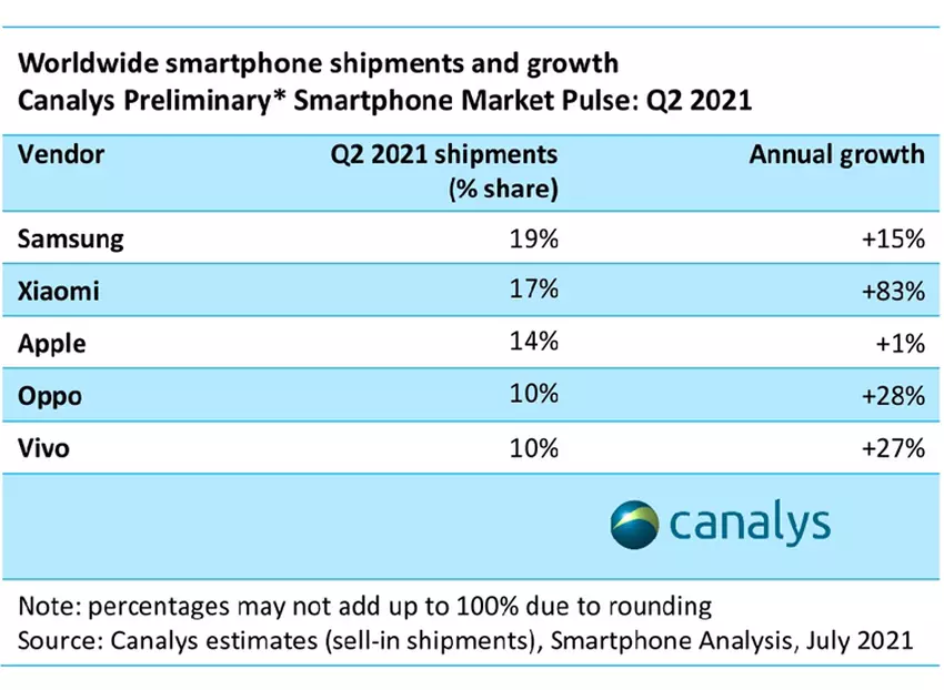 Drei Unternehmen aus China sowie je eines aus den USA und Südkorea sind unter den ersten fünf. Der südkoreanische Technologieriese Samsung ist mit einem Marktanteil von 19 % weiterhin führend. Im Vergleich zum zweiten Quartal 2020 konnte das Unternehmen seine Auslieferungen um 15 % steigern.