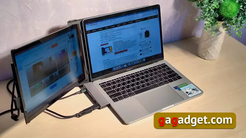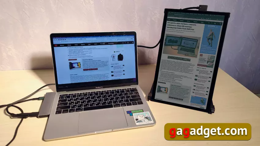 Die ersten tragbaren Monitore erschienen um 2010, kurz nachdem die USB-Stromübertragungsfähigkeit in den Spezifikationen auftauchte. Einer der ersten bemerkte Samsung, seine Modelle für Firmenkunden eingeführt HP, aber wie es oft der Fall ist, waren externe Monitore eine ziemlich enge Nische, mit spezifischen Kundenbedürfnissen. Infolgedessen hat sich Asus, das regelmäßig eine Reihe von tragbaren Monitoren aktualisiert und unterhält (wir hatten sogar ein paar Testberichte: MB168B und MB168B+ und ZenScreen GO MB16AP), in dieser Nische etabliert. Ich habe versucht, solche externen Monitore zu verwenden, aber irgendwie haben sie nicht gehalten. Ich habe auch versucht, ein iPad als externen Monitor zu verwenden. Diese Funktion wurde vor ein paar Jahren in macOS eingeführt und war, wenn ich mich recht erinnere, ab 2018 für macbooks verfügbar. Einerseits sah die Idee kurios aus: Das iPad wird als zweiter Bildschirm drahtlos angeschlossen. Andererseits braucht es immer noch Strom, und ja, auch einen Ständer. Außerdem hinkte bei dieser Verbindung alles unerbittlich hinterher, so dass ich diese Experimente aufgegeben habe.