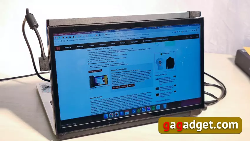 Der externe Monitor DUEX Plus von Mobile Pixels hat mich aus mehreren Gründen interessiert. Erstens bot es eine clevere Designlösung und löste Probleme mit der Tragbarkeit (das Display wird an der Rückseite eines Laptops befestigt und lässt sich so leicht transportieren und in einem Rutsch auf- und zuklappen) und der Stromversorgung. Zweitens entsprach es der Größe eines 13"-Macbooks (DUEX Plus 13,3" Diagonale, es gibt auch eine Version DUEX Lite, die 12,5" hat). Ein weiterer Vorteil scheint schließlich die Tatsache zu sein, dass sich der Hersteller ausschließlich auf diese Geräte konzentriert und keine anderen Produkte herstellt. In der Praxis erzielen solche Neugründungen, die auf Enthusiasmus und dem Wunsch beruhen, ein einzelnes Problem zu lösen, dies aber mit Witz tun, oft gute Ergebnisse. Ich war auch von der Möglichkeit fasziniert, das Display umzugestalten. Es hat auch Treiber für Windows und MacOS, kann mit Samsung-Smartphones im Dex-Modus und mit der Nintendo Switch-Spielkonsole arbeiten, was die potenzielle Zielgruppe gut erweitert. Die Spezifikationen des Displays sind einfach: FullHD-Auflösung, 300 nits Helligkeit, 4,5 Watt Stromverbrauch und eine Abtastrate von bescheidenen 60 Hertz. Es gibt zwei USB-C-Eingänge und Touch-Tasten auf dem Gehäuse für die Menüsteuerung (ja, es hat ein einfaches Menü für die Helligkeitssteuerung).