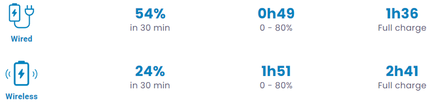 An dieser Stelle stieß das Smartphone auf Probleme. Die Januar-Neuheit unterstützt die 25-Watt-Ladung per Kabel. Der Akku ist in 96 Minuten vollständig "aufgeladen". Bemerkenswert ist, dass die ersten 54 % der Kapazität innerhalb von 30 Minuten erreicht werden, während bis zu 80 % des Akkus in 79 Minuten aufgeladen sind. Wie Sie verstanden haben, dauern die letzten 20 % 17 Minuten.