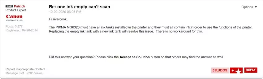 Seit 2016 haben sich zahlreiche Nutzer mit ähnlichen Problemen an Canon gewandt. Der technische Support des Unternehmens hat immer geantwortet, dass diese Multifunktionsgeräte mit Tonerkartuschen ausgestattet sein müssen, um ordnungsgemäß zu funktionieren. Außerdem sind selbst für den Druck von Schwarzweißbildern alle Farbtinten erforderlich. Der technische Support von Canon erklärt, dass es zu Fehlfunktionen des Druckers kommen kann, wenn nicht alle Tonerkartuschen eingesetzt sind.