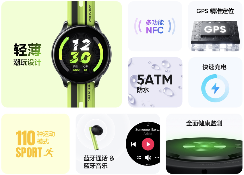Das Modell hat ein Stahlgehäuse mit Wasserschutz (5ATM) und ein rundes AMOLED-Display mit einem Durchmesser von 1,3 Zoll. Der Bildschirm hat Auflösung Bildauflösung 416×416p. Die Uhr unterstützt Always On Display, 110 Sportmodi und kann Herzfrequenz, Schlaf und SpO2 messen sowie Musik und Smartphone-Kamera steuern. Die Neuheit verfügt über ein NFC-Modul.
