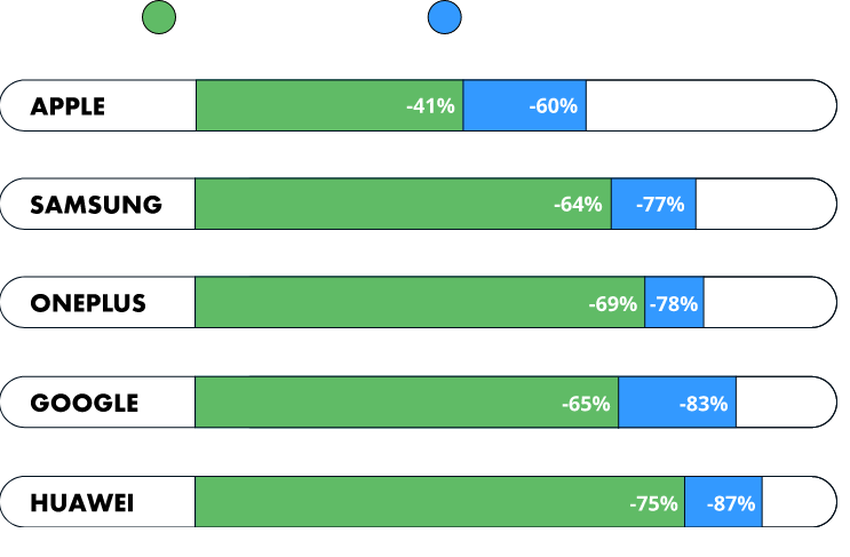 ?Erwartungsgemäß sind Apple und Samsung die Unternehmen, deren Geräte in den ersten 12 Monaten am wenigsten an Wert verlieren. Im Durchschnitt verlieren Apple-Geräte in einem Jahr 41 % ihres Wertes und in 24 Monaten 60 %. Für Samsung sind diese Zahlen etwas höher - 64% und 77%.