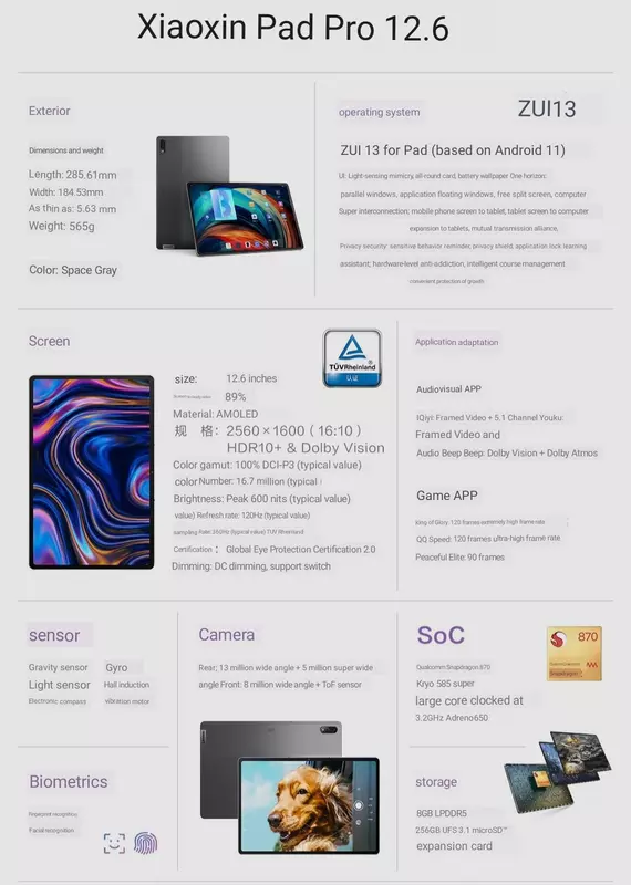 So wird das Xiaoxin Pad Pro 12.6 die Abmessungen 285,61×184,53 mm und eine Gehäusedicke von nur 5,63 mm haben. Das Tablet wird mit einem Metallgehäuse und einem 12,6-Zoll-Bildschirm mit einer Auflösung von 2560×1600 Pixeln, einem Seitenverhältnis von 16:10 und einer Bildwiederholfrequenz von 120 Hz ausgestattet sein. Das Panel wird HDR10+ und Dolby Vision unterstützen.
