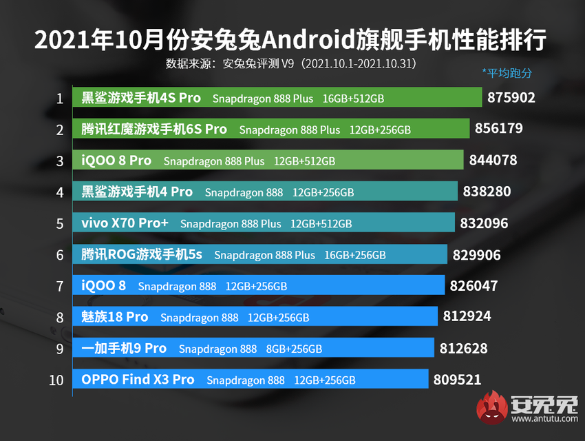 Die Top drei sind Smartphones, die auf dem 5nm Snapdragon 888+ Chip basieren. Den Anfang machte das Black Shark 4S Pro mit 16 GB RAM. Sie erhielt 875.902 Punkte im Benchmarking. Es folgen das Nubia Red Magic 6S Pro und das Vivo iQOO 8 Pro mit 12 GB, die 856.179 bzw. 844.078 Punkte erreichten.