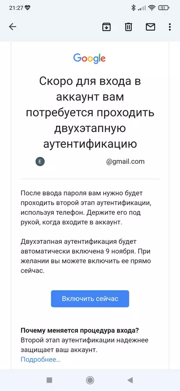 "Nachdem Sie Ihr Passwort eingegeben haben, müssen Sie eine weitere Aktion mit Ihrem Smartphone durchführen . Halten Sie Ihr Telefon bereit, wenn Sie sich bei anmelden. Die zweistufige Authentifizierung wird am 9. November automatisch aktiviert. Wenn Sie möchten, können Sie diese Funktion im Voraus aktivieren: Ihr Konto ist bereit", - sagte in einem Google alert.