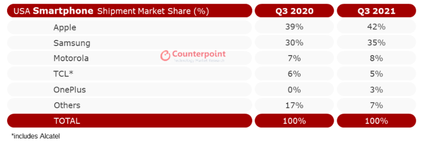 Das Analystenbüro Counterpoint hat die Ergebnisse der US-Smartphone-Marktforschung für das dritte Quartal 2021 veröffentlicht.