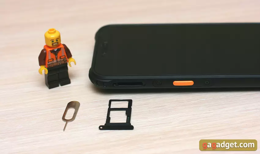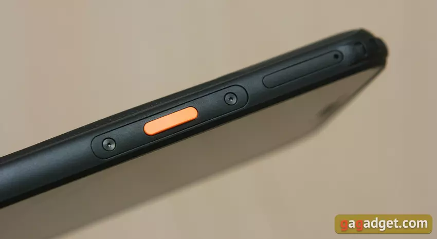 Auf der linken Seite des Rahmens befinden sich eine separate orangefarbene Taste (der eine der Aktionen zugewiesen werden kann, ich erzähle es euch später), ein USB-C-Anschluss, der mit einer Gummikappe abgedeckt ist, und ein SIM-Kartensteckplatz. Auf der rechten Seite des Smartphones befinden sich eine Einschalttaste und eine doppelte Lautstärkeregelungstaste. Alle Tasten sind aus Kunststoff und drücken mit angenehmer Kraft und einem deutlichen Klick.