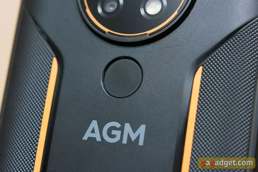 Das Hauptelement auf der Rückseite ist die runde Kameraeinheit. Sie sind alle mit einem gemeinsamen Glas abgedeckt, dessen Rahmen ebenfalls leicht über die Oberfläche hinausragt. Es gibt drei Kameras, die aus Gründen der Symmetrie durch einen LED-Blitz ergänzt werden. Zwischen den Kameras und dem Logo befindet sich ein Fingerabdruckscanner. Ein Teil der Oberfläche der Rückseite ist mit einem matten Kunststoff (völlig abriebfest) und ein Teil mit einer ungewöhnlichen Rillenstruktur versehen. Offenbar, um das Abrutschen des Geräts in der Hand zu verhindern. Es ist wirklich gut haltbar und fühlt sich angenehm an. Orangefarbene Streifen im Ton der Taste und der Einfassung der Kameraeinheit spielen eine dekorative Rolle und machen das Smartphone auffälliger. Wenn es zum Beispiel in den Schmutz fällt.
