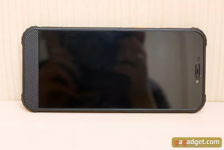 Ach ja, im Gegensatz zu den typischen modernen Smartphones, die wie eine Kopie gezeichnet sind, gibt es hier etwas zum Anschauen. Die Vorderseite des AGM H3 ist im Geiste der "Vor-Desrama"-Zeiten gestaltet, mit einem großen Lautsprechergitter, das den Platz unter dem Bildschirm einnimmt, und einer Einfassung der alten Schule, die den Talkback-Lautsprecher, die nach vorne gerichtete Kamera und die Sensoren enthält, die oben zu sehen sind.