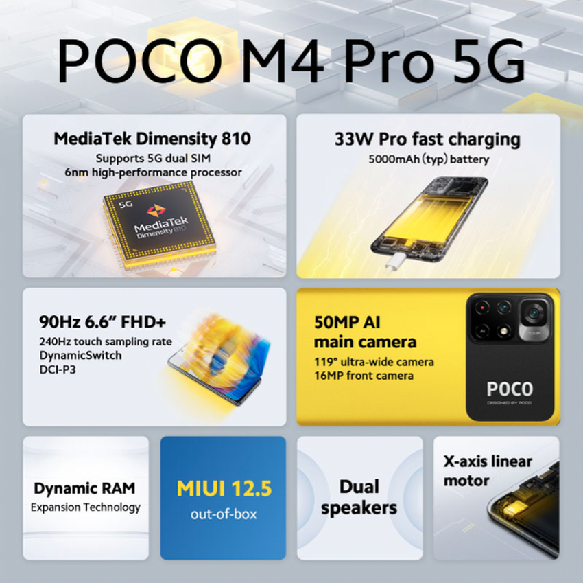 Recall, POCO M4 Pro 5G ist eine Kopie der Specs präsentiert letzten Monat in China Redmi Note 11. Das Smartphone verfügt über einen 6,6-Zoll-LCD-Bildschirm mit FHD+-Auflösung und einer adaptiven Bildwiederholfrequenz von bis zu 90 Hz. Die Neuheit läuft mit dem MediaTek Dimensity 810 Chip. Das Smartphone verfügt außerdem über ein 5G-Modem, einen 5000-mAh-Akku mit 33-Watt-Ladefunktion, Stereolautsprecher, einen X-Achsen-Vibrator , eine 50-MP- + 8-MP-Hauptkamera und eine 16-MP-Frontkamera. Das Gerät wird mit der MIUI 12.5-Oberfläche ausgeliefert.