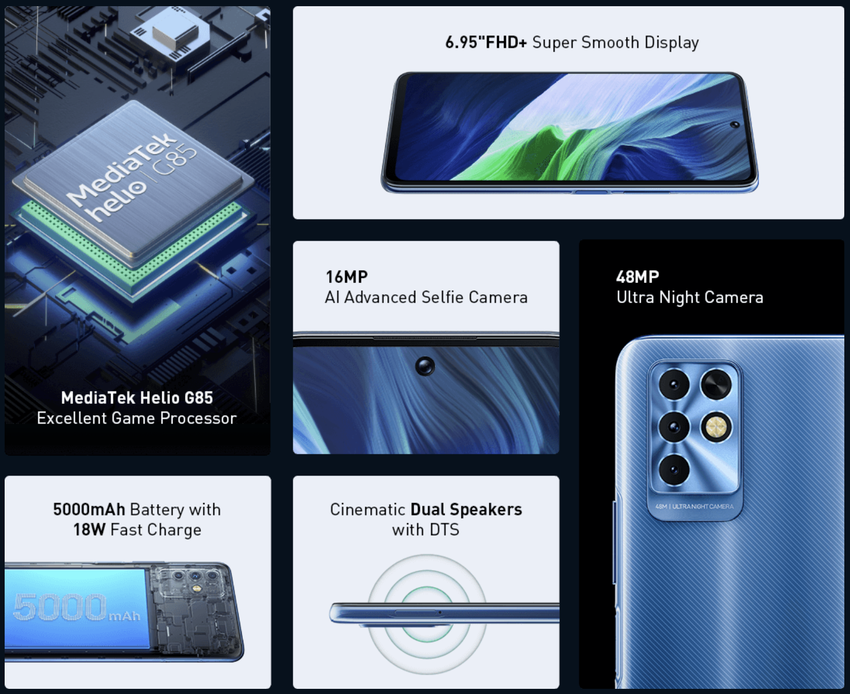 Die Neuheit hat ein großes 6,95-Zoll-IPS-LCD-Display mit einer Auflösung 2460×1080p, einem Seitenverhältnis von 20,5:9 und einer Sensor-Lesefrequenz von 180 Hz. Unter der Haube wird das Gerät von einem MediaTek Helio G85 Octa-Core-Prozessor angetrieben, gepaart mit 4 GB RAM und 64 GB internem Speicher. Sie kann auf Wunsch mit einer MicroSD-Karte erweitert werden.
