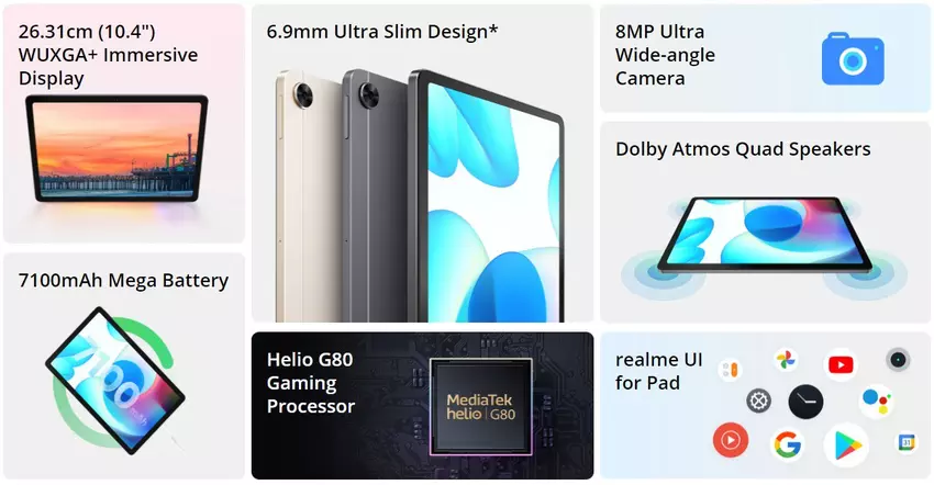 Die europäische Version unterscheidet sich nur in drei Punkten von der indischen Version. Der Preis ist gestiegen, es gibt keine LTE-Unterstützung und es gibt weniger Speicheränderungen. Die übrigen technischen Daten sind gleich geblieben. Das Realme Pad ist mit einem 10,4 Zoll großen IPS-LCD-Bildschirm mit einer Auflösung von 1200 x 2000 Pixeln und zwei 8-MP-Kameras ausgestattet.