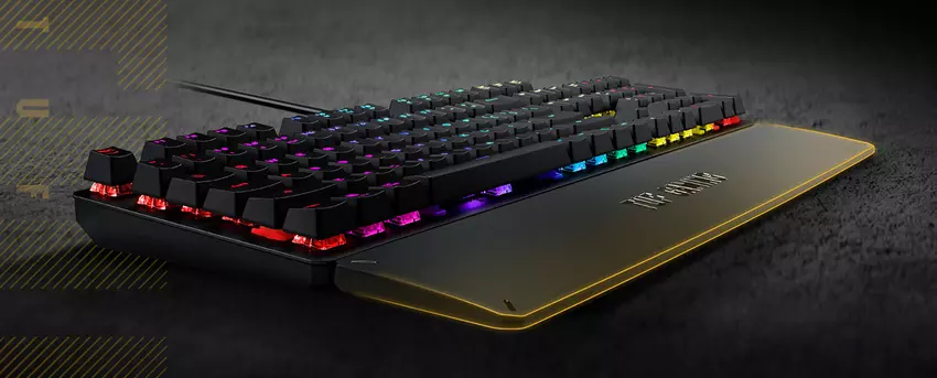 Mechanische Tastatur mit Aura Sync RGB-Hintergrundbeleuchtung, Multimedia-Tasten, USB 2.0-Pass-Through-Anschluss und programmierbaren Tasten.