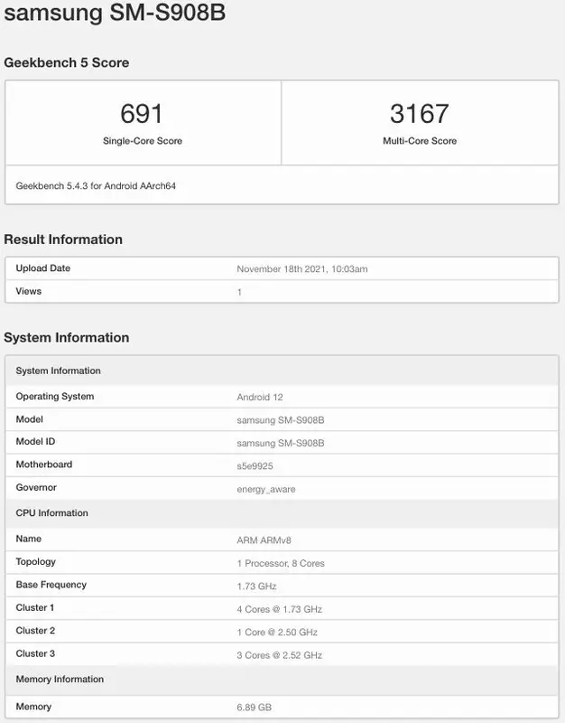 Der Benchmark testete eine Version mit dem Exynos 2200 (s5e9925) Prozessor, 8 GB RAM und Android 12 als Betriebssystem. Das Ergebnis des Flaggschiffs war recht zweideutig. Im Single-Core-Test erreichte das Modell 691 Punkte, während es im Multi-Core-Test 3.167 Punkte erreichte.